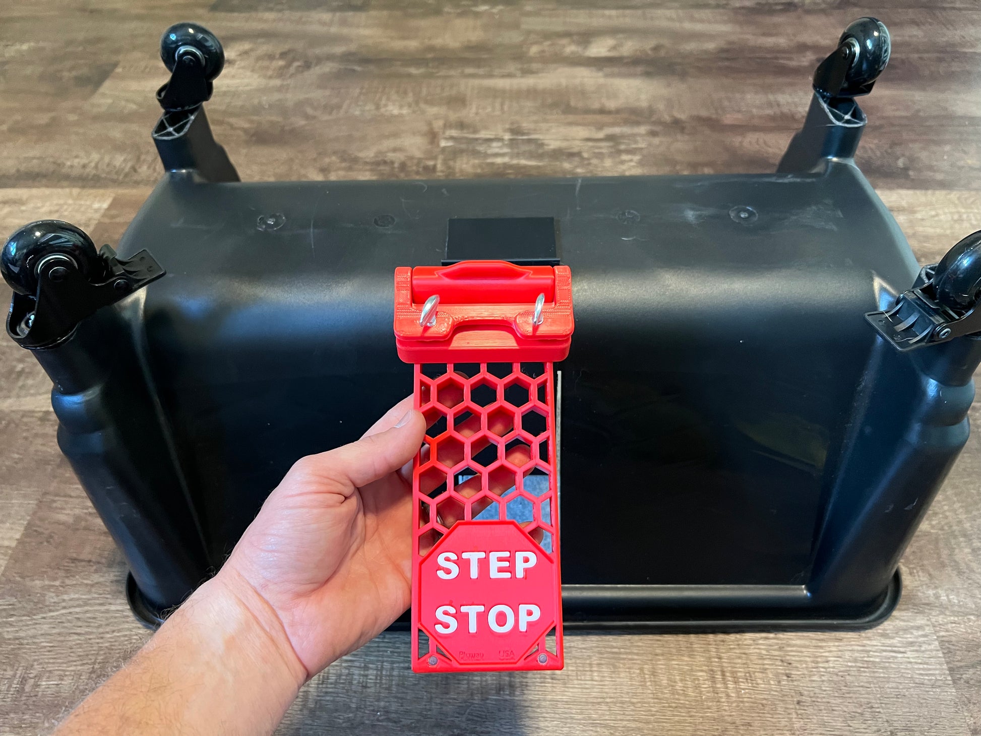 Step Stop is a tool for efficient painting. It allows you to keep the paint bucket next to you where you need it. The wheels glide smoothly on many different types of surfaces. The Step Stop keeps it from rolling while filling your roller.