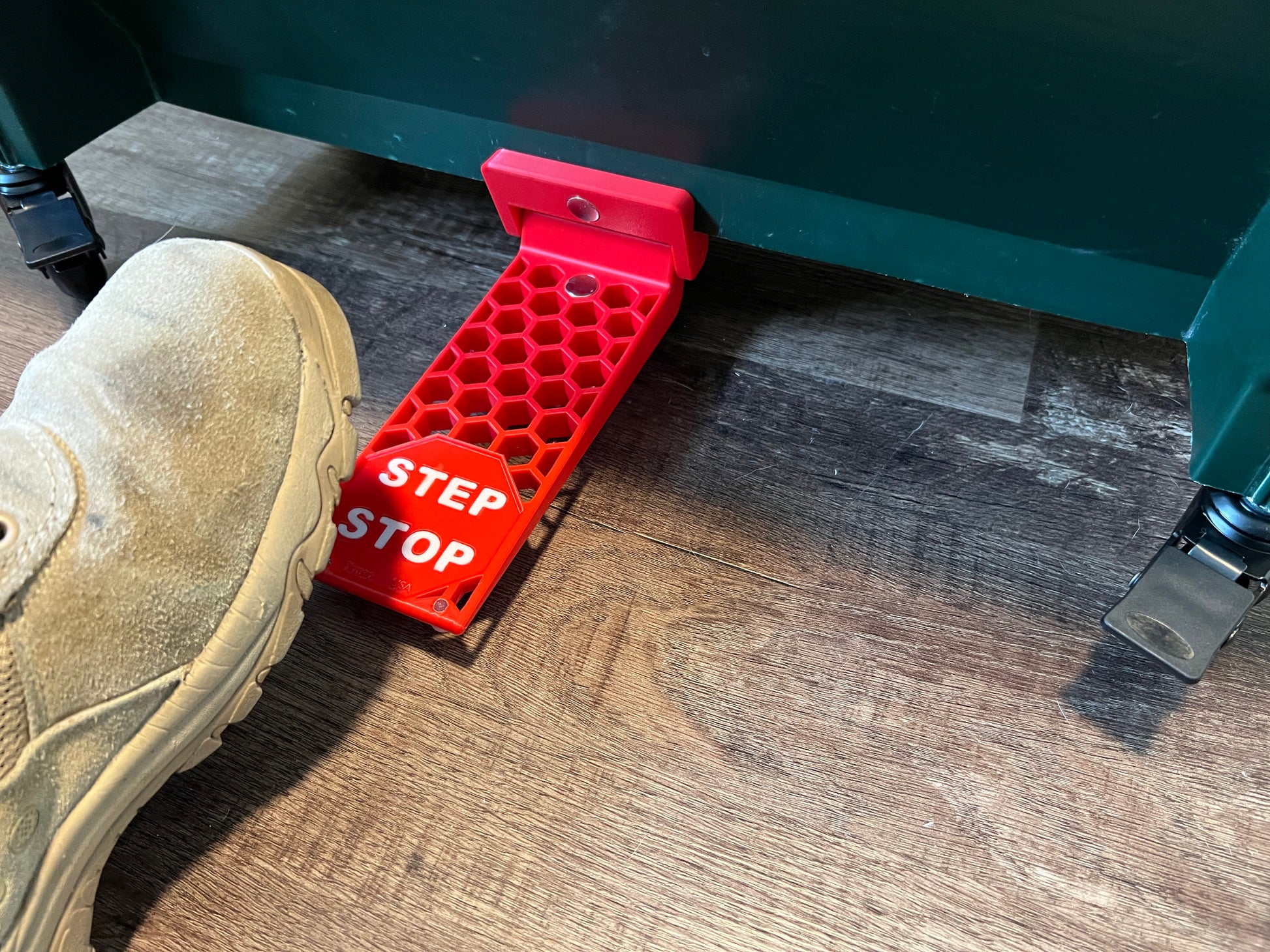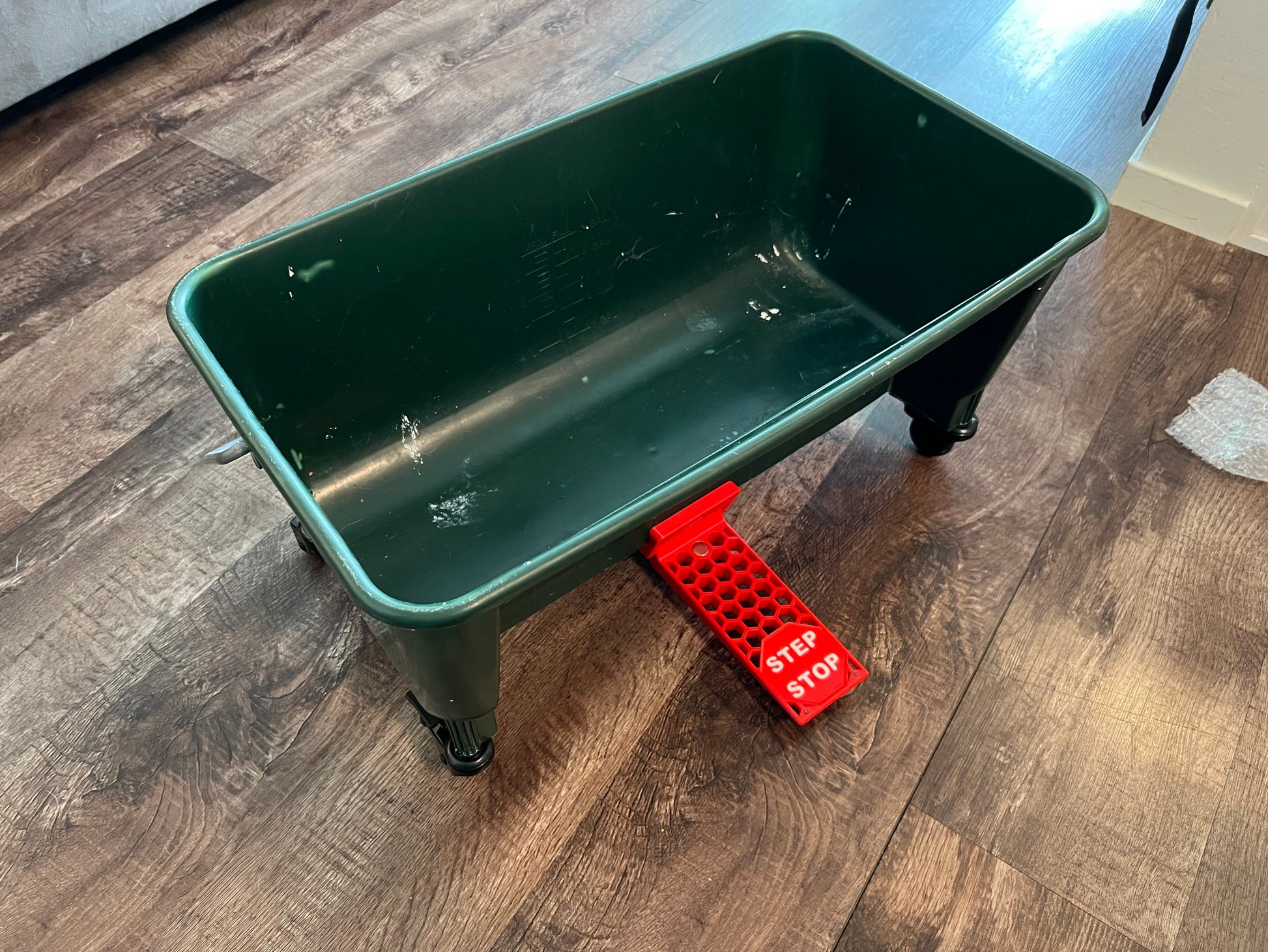 Step Stop is a tool for efficient painting. It allows you to keep the paint bucket next to you where you need it. The wheels glide smoothly on many different types of surfaces. The Step Stop keeps it from rolling while filling your roller.